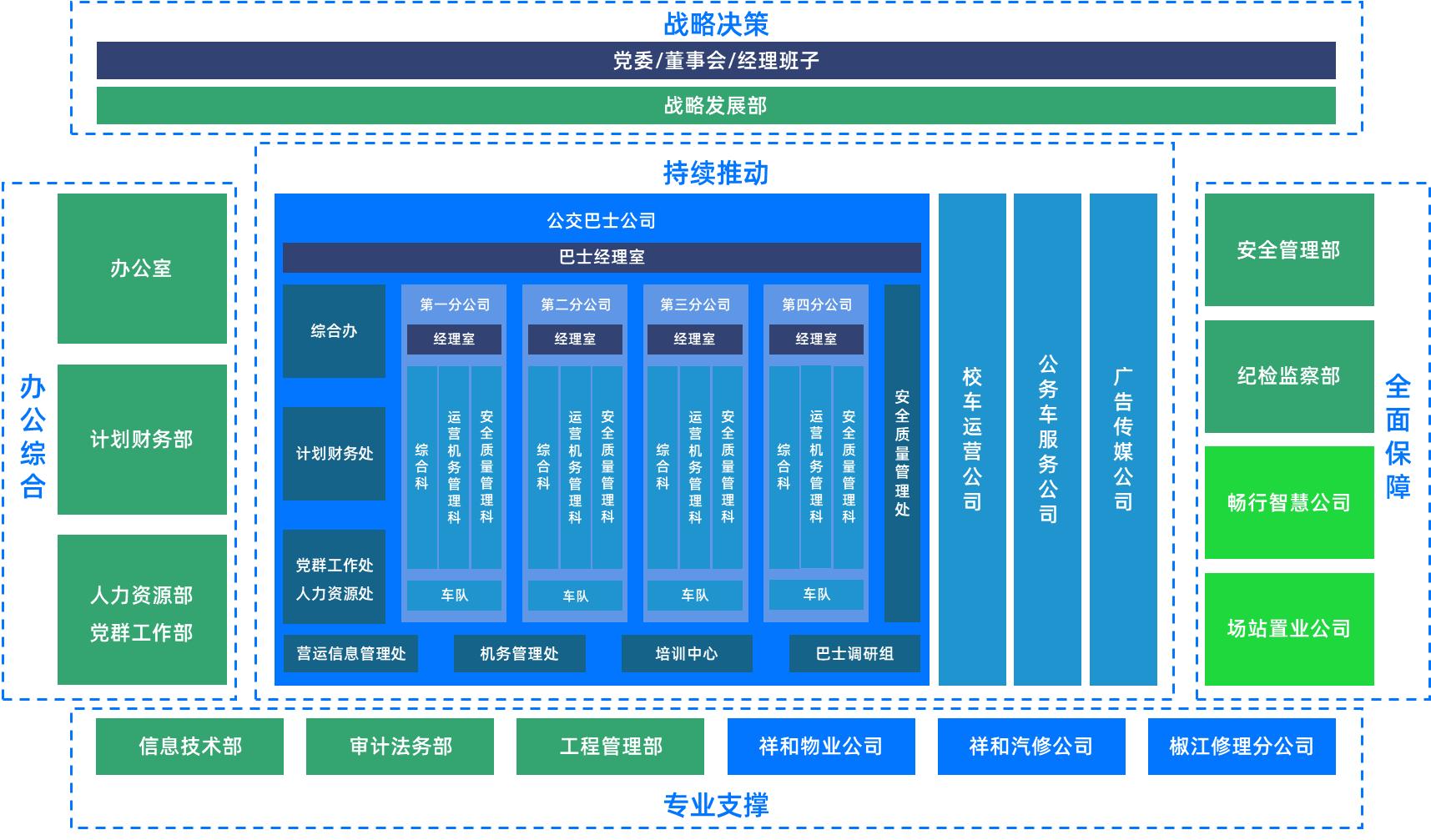 根据“上战略决策、下专业支撑、左办公综合、右全面保障、中持续推动”的原则,对台州公交集团的组织架构进行重新组合分析。