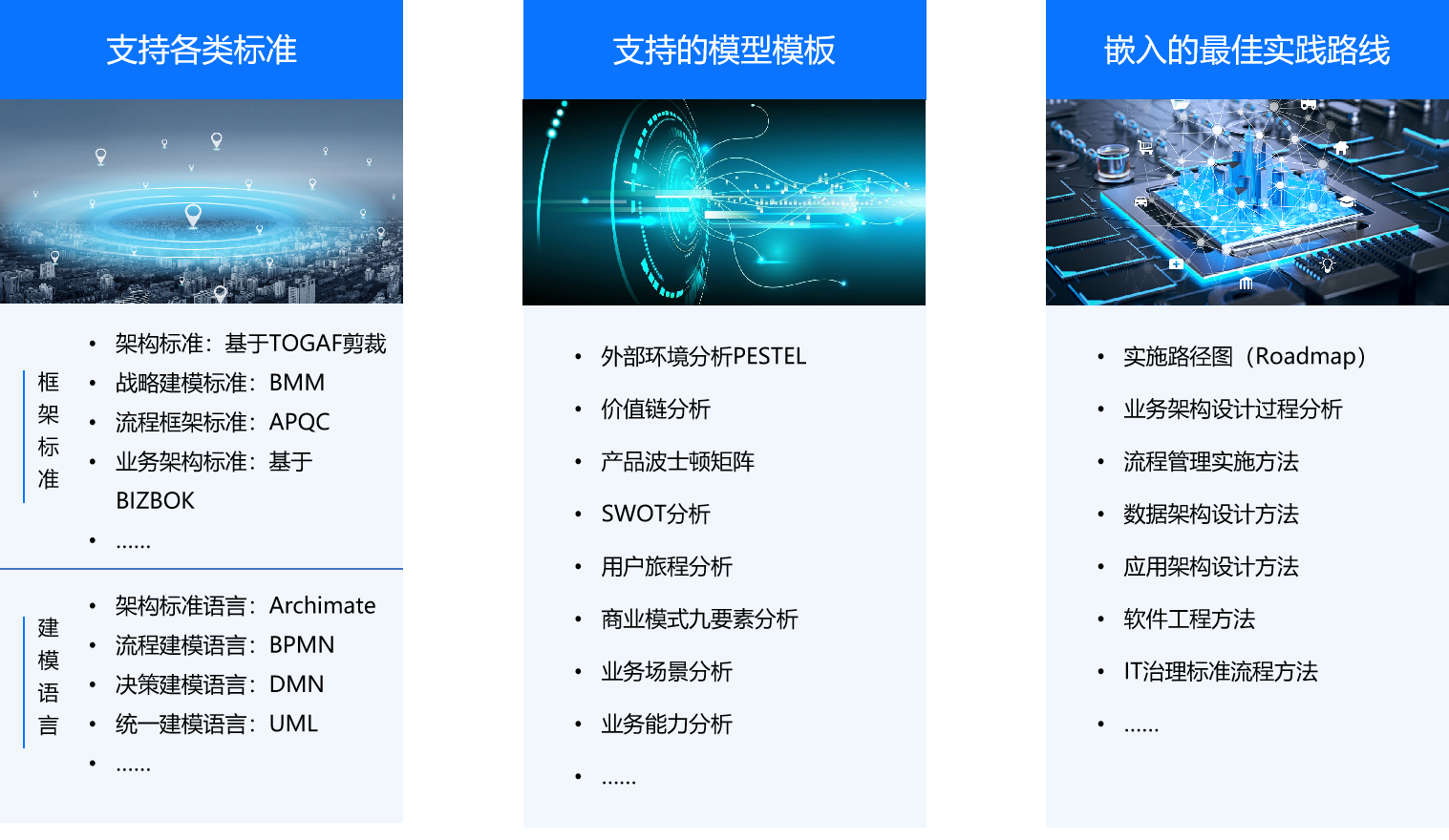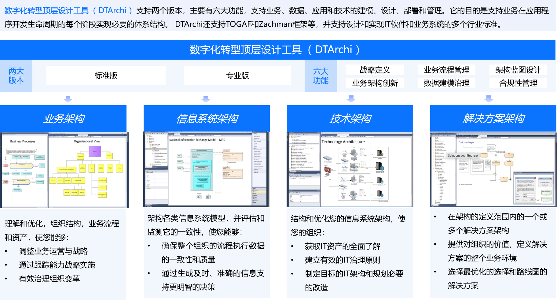 数字化转型顶层设计工具( DTArchi )具有支持各类标准、模版、嵌入最佳实践线路的特性。