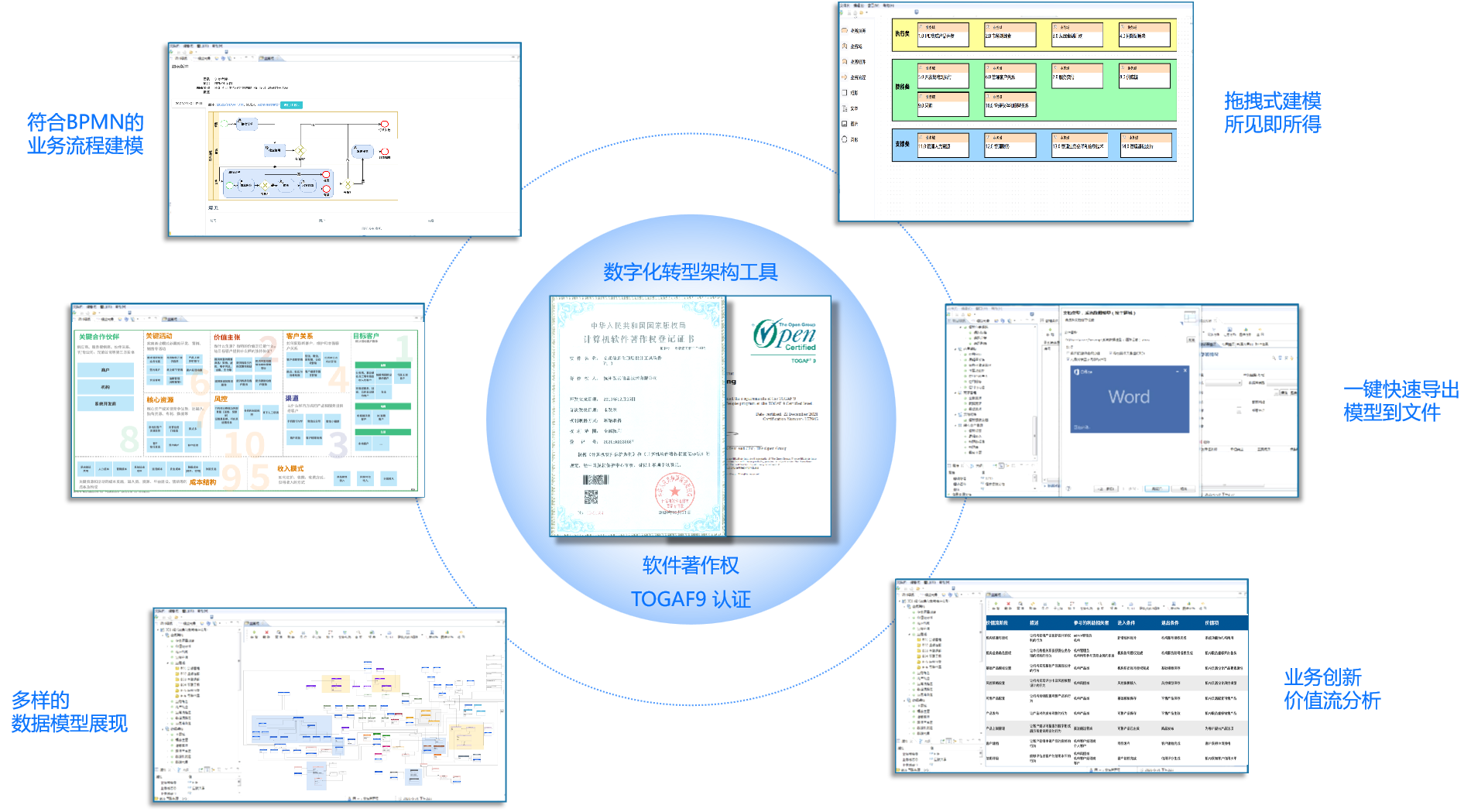 数字化转型顶层设计工具( DTArchi )通过了TOGAF9认证,具有符合BPMN的业务流程建模、灵活的战略分析图表、多样的数据模型展现、拖拽式建模所见即所得、一键快速导出模型到文件、业务创新价值流分析六大特点。
