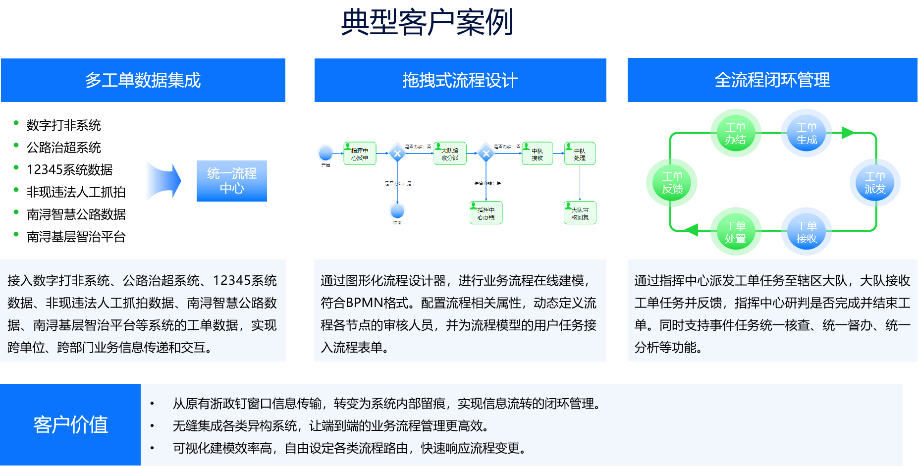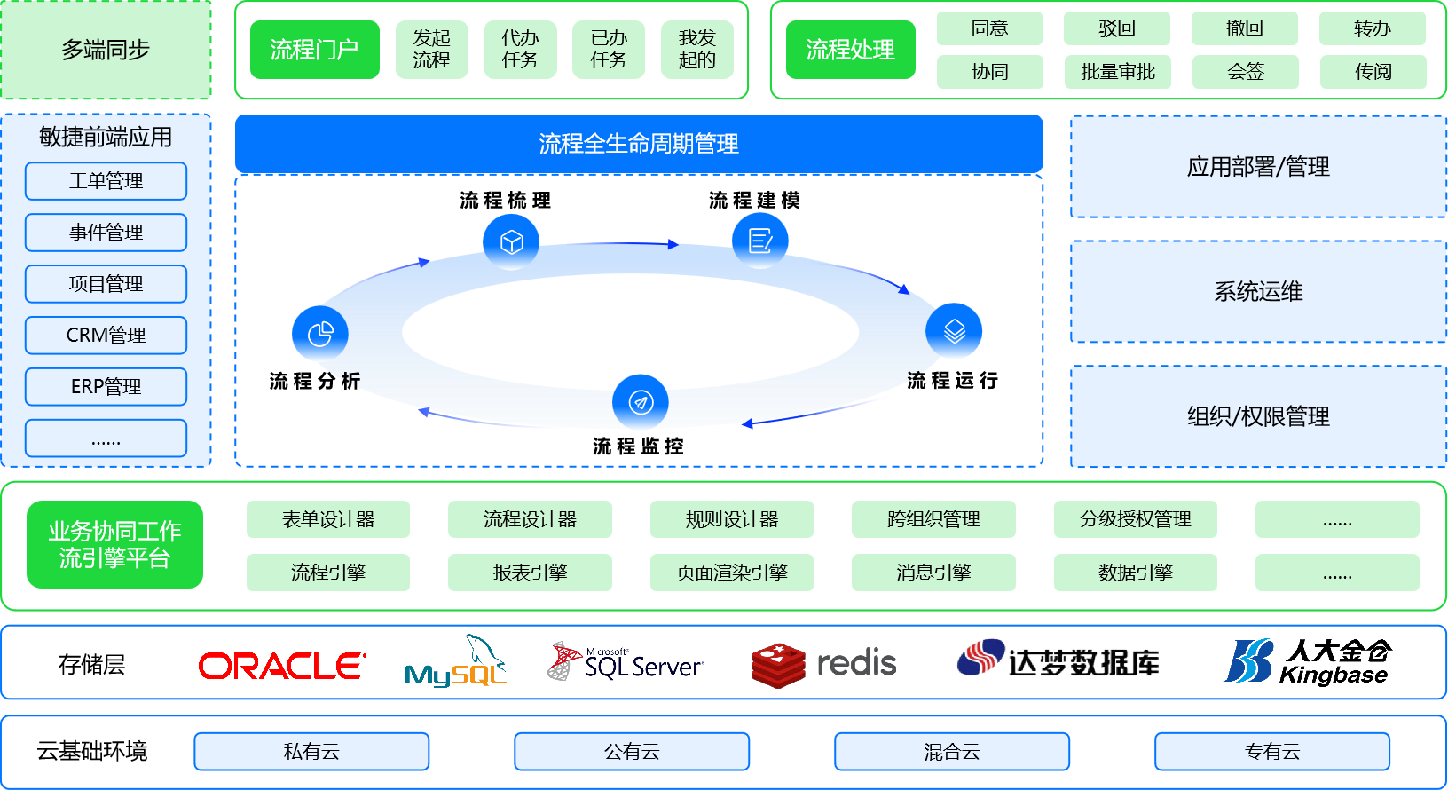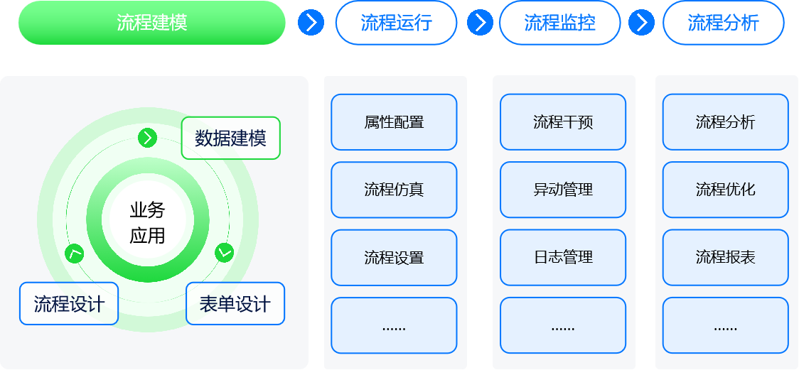 - 围绕流程梳理与建模、流程运行、流程监控、流程分析,实现精细化流程管控