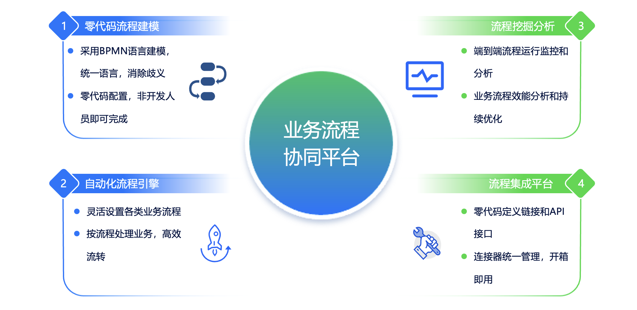 弘云业务流程协同平台包括零代码流程建模、自动化流程引擎、流程挖掘分析模块和流程集成平台4大功能。