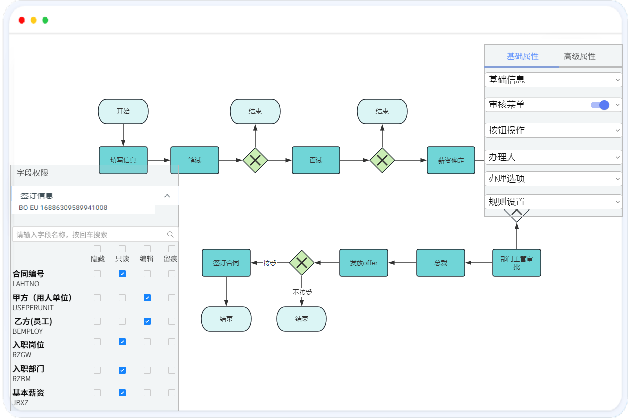 灵活配置各个流程节点的流转规则,办理人员、审核菜单、按钮操作、办理选项等,自定义设计流程节点的流转路径和业务规则。