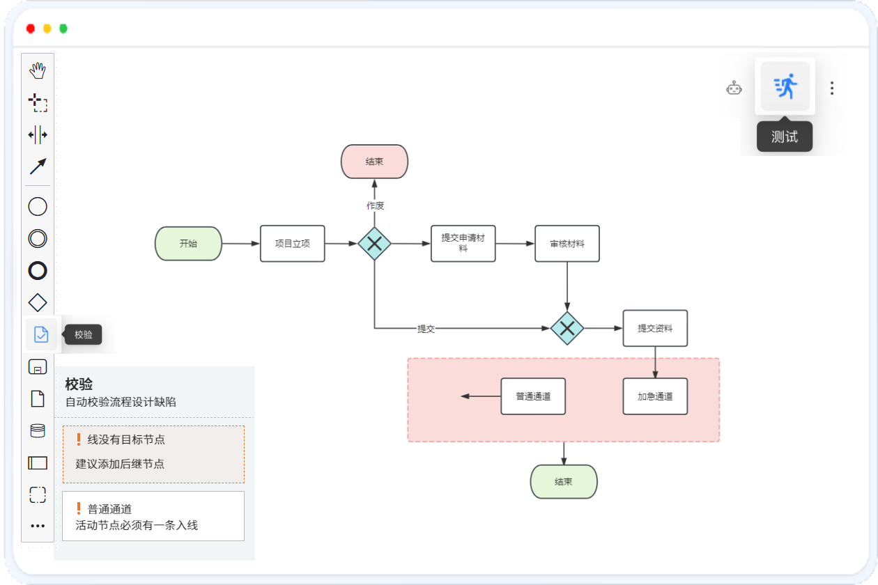 流程设计完毕可实时在线运行测试,根据流程规则,每个节点自动进行校验、发送审批消息通知,自动完成业务的流转审批。